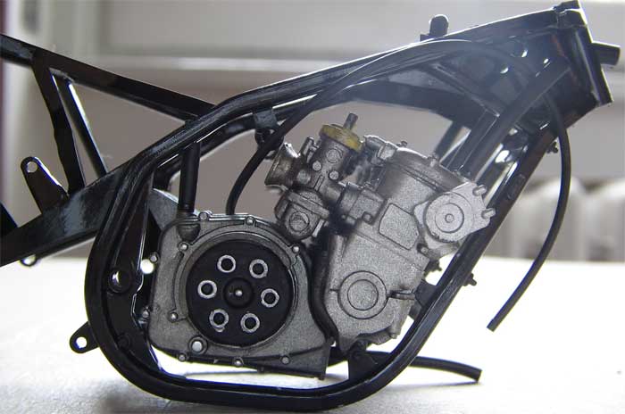 A voi le prime fotografie, per ora ho montato telaio e parte del motore, devo dire che è molto dettagliato, belli i carburatori, solo qualche piccola sbavatura negli stampi, ma con il cutter tutto si risolve.
