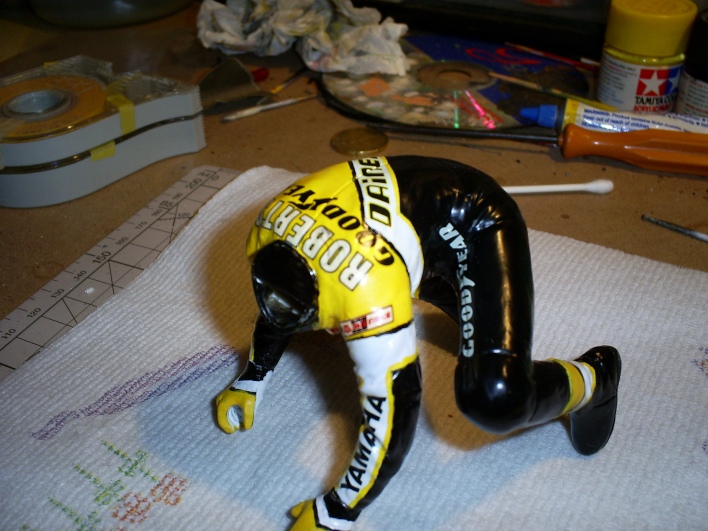 per il resto del figurino...io cercherei di lumeggiare un po il giallo e leggermente il nero...solo per dare un po di realismo in piu.....e infine per quanto riguarda la moto...nulla da dire ma come ne parlavo al telefono con ros ci sarebbero da fare due modifiche per dare il vero senso di velocità in curva (farai il diorama vero?!!!!) l'acetato sui cerchi....(ricordate robiturbo!) e modificare la catena..tipo eliminando perni tra una maglia e l'altra per simulare sempre il movimento....e proprio per fare un lavoro con i fiocchi...ci sarebbe pure la corona da rifare sempre in acetato e i dischi davanti se hanno un disegno particolare che in velocità ovviamente cambia....cmq anche cosi lo sai benissimo che ha il suo effettissimooooooo