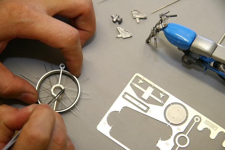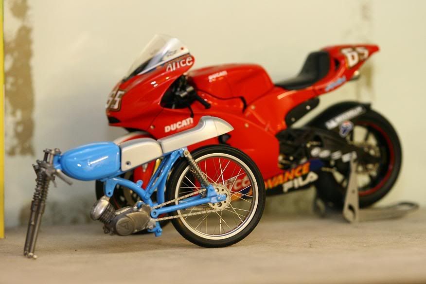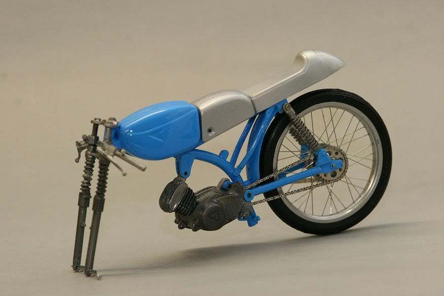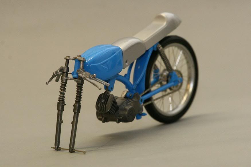 Gran bel pezzo! e che ordine, soprattutto la zona dei cerchi, vale la pena solo per quelli. la zona della forcela in fusione non i convince, comunque, il risultato è molto bello, anche se sono convinto che con la derbi il risultato non era poi male, ed erano fattti passo passo e in due pezzi. Certo, questo è piú pulito e professionale.