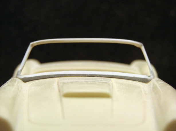 A costo di ripetermi vi dirò che ho sudato parecchio per farlo, anche perchè è particolarmente complesso sulla base dove rimane sagomato per seguire le linee del cofano e del profilo laterale dei fari. Dopo averci studiato parecchio    ho optato per il plasticard anche se sapevo le difficoltà a cui andavo incontro. Per ovviare un poco all'estrema delicatezza del pezzo, ho usato della pasta bicomponente (non so bene cosa sia), tipo quelle che si usano per ancorare i fisher al muro quando non attaccano.