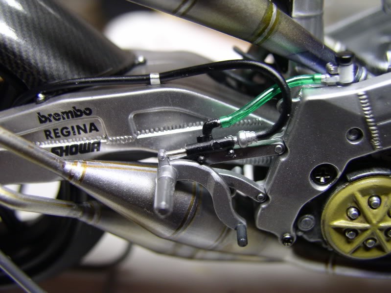 La pompa del freno post. si è rotta visto che è attaccata solo con l'asta del pistoncino, così l'ho rifatta con del tondino cromato da 0.7 Sembra vera! Ne ho approfittato per attaccare la pompa alla staffa pedana con 2 gocce d'attak visto che la pompa si libra nel vuoto. Ho provato anche sulle altre ma la rigidità dei tubi complica le cose.