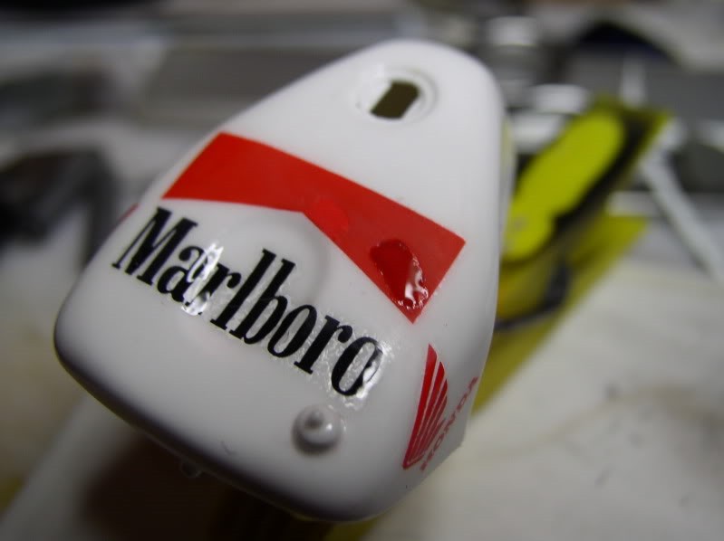 ) ... a causa delle decal forse vecchie, la scritta nera ha fatto delle bollicine con il trasparente, e va beh, niente da fare se non carteggiare tutto e mettere una scritta nuova che non ho. Il logo rosso invece ha fatto 2 belle bolle, che avrei potuto lasciare lì ma neanche per sogno. Carteggiato fino alla decal, tagliata la decal, fatta aderire con l'ammorbidente, ritoccato con il rosso,