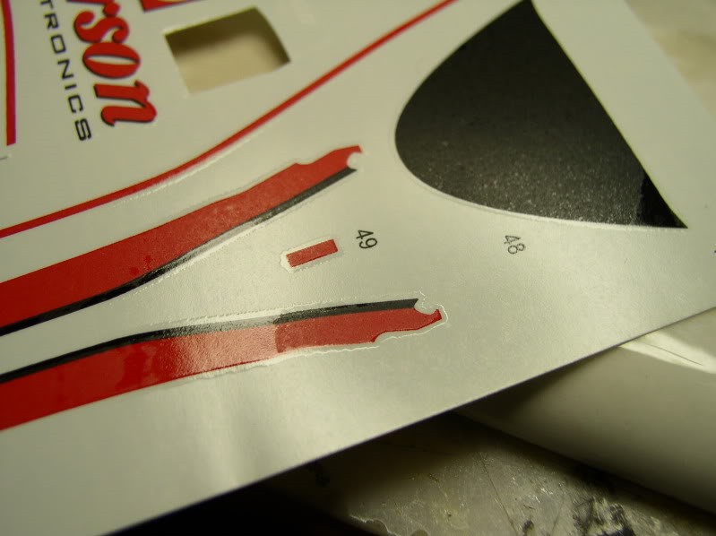 Ho cominciato a mettere le decal sulla Emerson ma ho avuto una bella sorpresa, il foglietto di carta per proteggere le decal si era attaccato alle stesse, e staccandolo ha fatto rimanere tutte le deca opache, lo potete notare sull'angolo della deca nera e sulla striscia rossa. Ho provato a passarci un pò di compund ma niente. Speriamo che il lucido attacchi....
