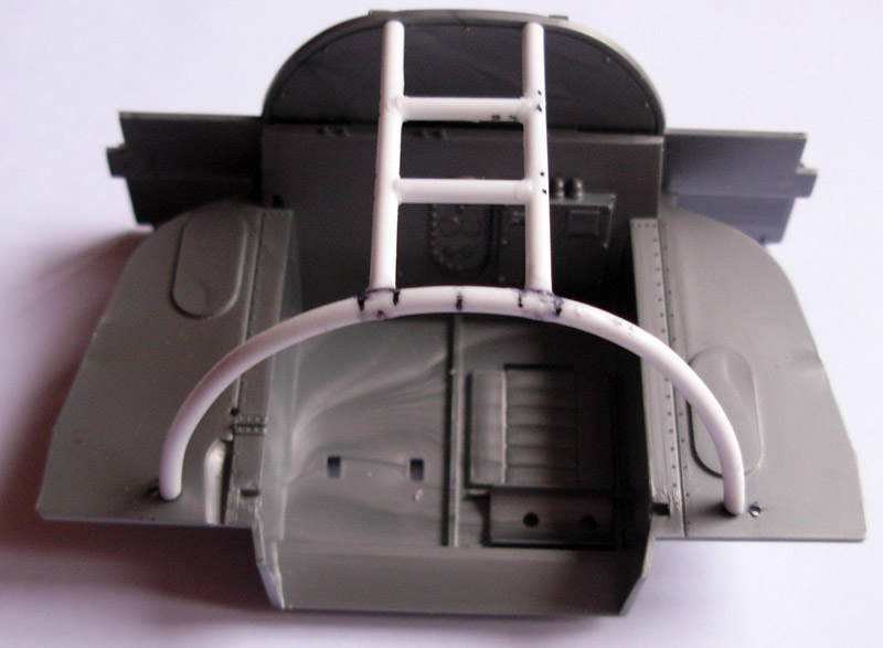 Per cominciare mi sono autocostruito il rollbar all'interno dell'abitacolo usando tondini di plasticard da 2mm. Per assemblarli li ho forati con il trapanino a mano, messo delle spinette con il filo di rame e poi ho incollato tutto. Ecco come è venuto. Considerate che i fori più esterni alla base del rollbar verranno chiusi, sono un errore.
