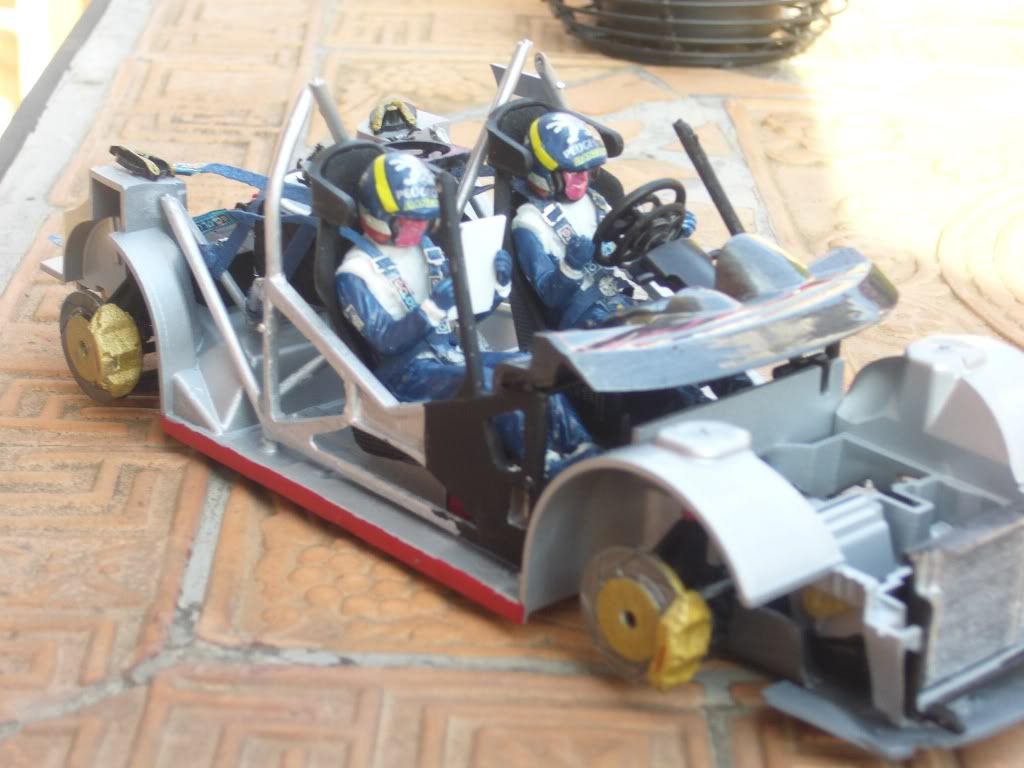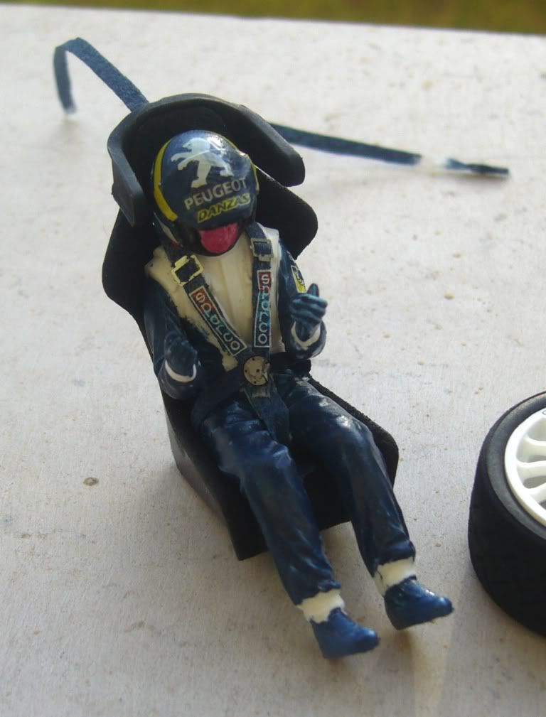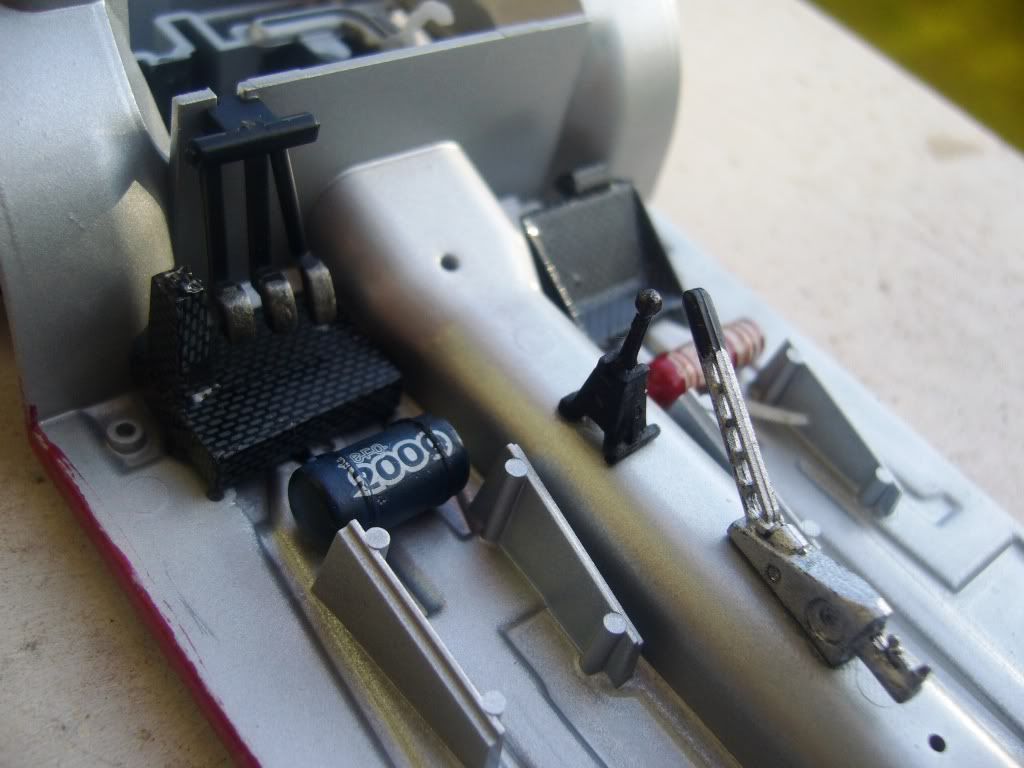 3) Sedili: hai lavorato bene, vedo che hai usato anche una qualche tecnica per rendere il tessuto dei sedili. Se hai un trapanino a mano e una punta di 2mm, rendi passanti i fori per inserire i lembi della cintura di sicurezza che passano sopra le gambe del pilota, così puoi attaccarli al pianale come dovrebbe essere nella realtà.