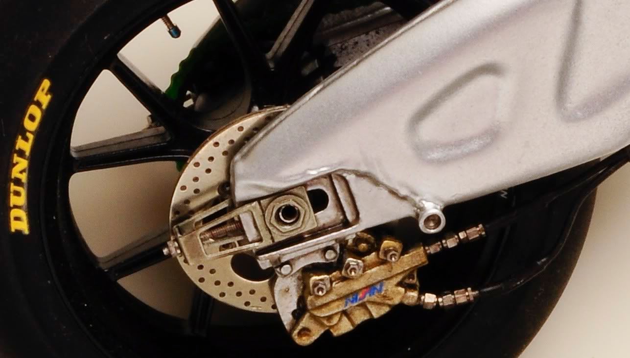 Purtroppo io ho solo un tubicino di 4mm per 2 di interno, era meglio un 3 per 1. Ne taglio un pezzetto, lungo cira 3-4 mm (poi si puo' accorciare), ora lo tagliamo in mezzo in modo da ottenere due pezzzetti a C. li incolliamo sull'estremità del cavalletto, dove ci andranno ad appoggiare i pernetti del forcellone. Stucco carta e colore, io gli ho fatti neri opaco.