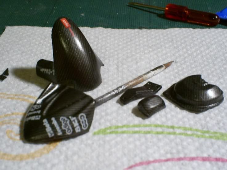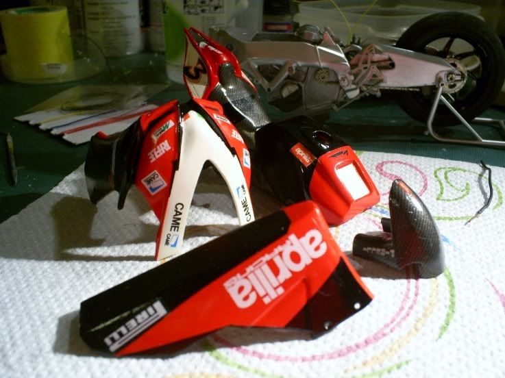 ciao segioint,io mi sto dedicando da poco alle decals di carbonio,e da principiante devo dire che e' proprio un casino quando devi fare anche una basetta piatta ma piena di angoli e spigoli raggiati...figurarsi una parafango o un carter.Penso che la prossima volta usero' il sistema cn la calza di nylon
