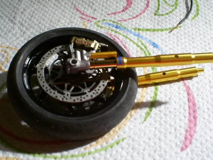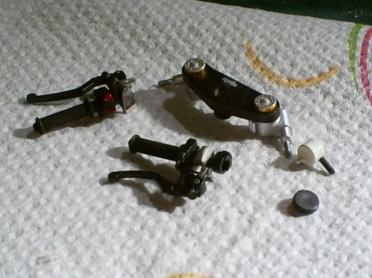 poi ho modificato i cavi della manetta, ho segato via i piruli, forato e inserito 2 pezzetti di ferro, uno sotto e l'altro sopra della leva, come da moto reale. mi mancano le fascettine alle manopole.