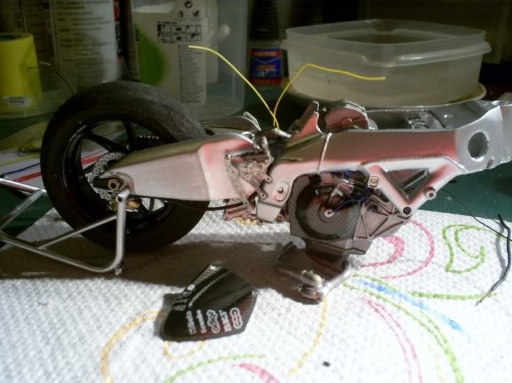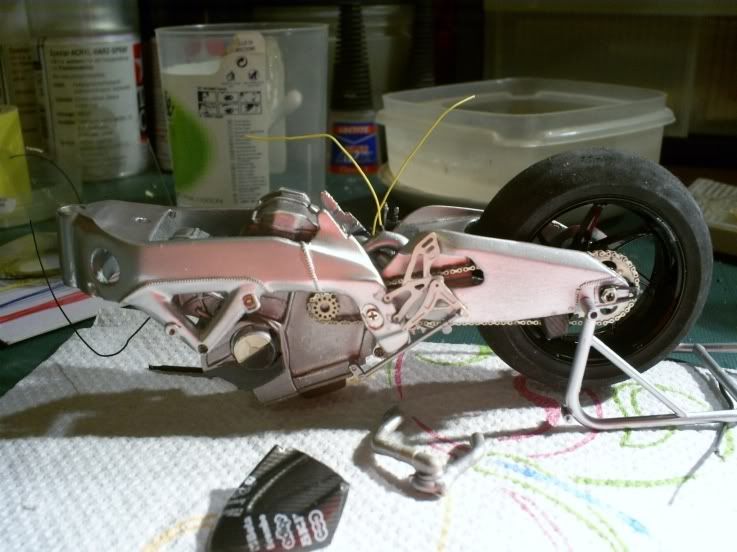 infine ho montato forcellone e motore al telaio. ho iniziato ad aggiungere qualche cablaggio al motore, per dargli anche un po' di vita... nudo sembra un pezzo di plasticone...
