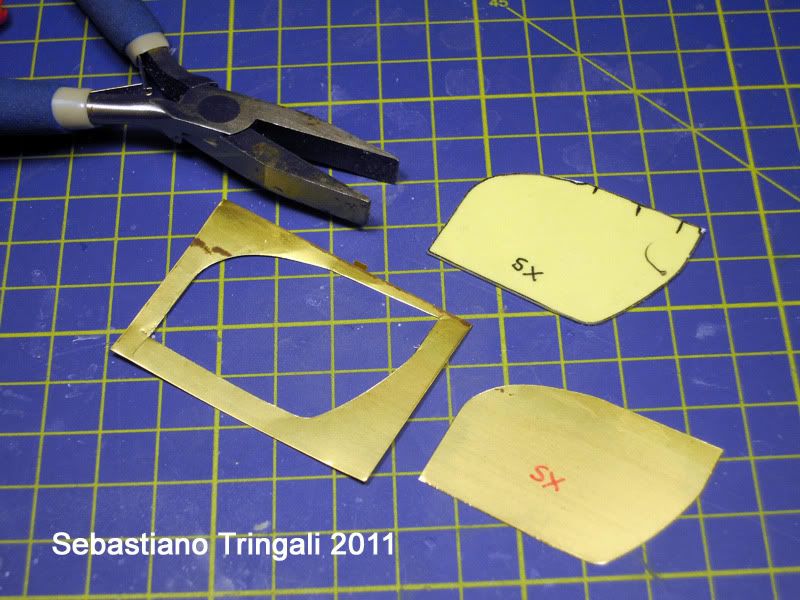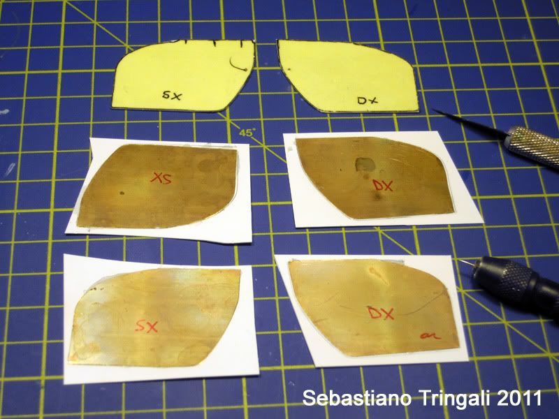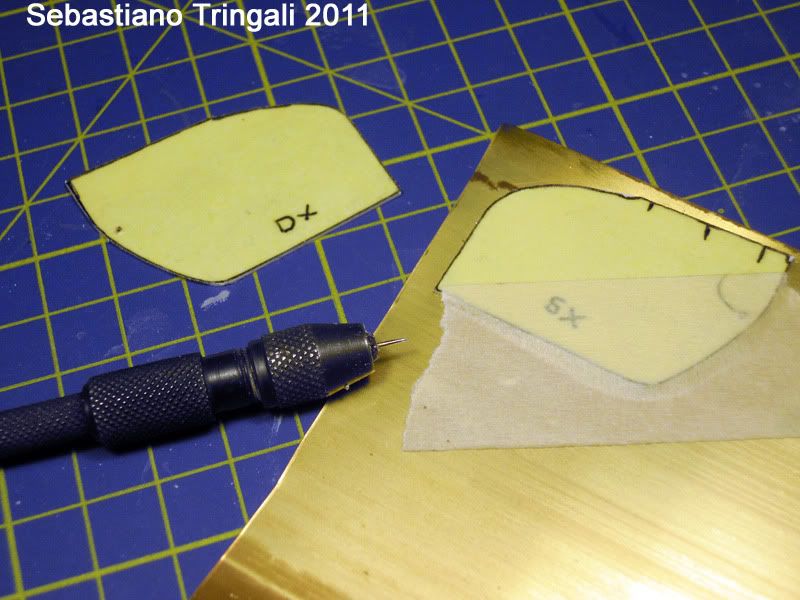 poi sono passato a modellarlo sullla carrozzeria per dargli la corretta curvatura, per facilitarmi il lavoro avevo provveduto preventivamente a riscaldare il lamierino di ottone ed a raffreddarlo bruscamente in acqua per renderlo più duttile e lavorabile........