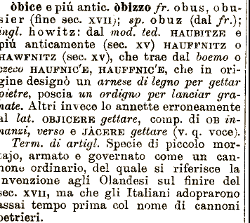 L’originale nome boemo houfnice (frombola) era stato adottato dai tedeschi in haubitze, che i francesi pronunciavano “aubùsse” e scrivevano di conseguenza obus: ma con un ingiustificata inversione metonimica chiamarono obus il proietto (granata) e obusier la bocca da fuoco, e l’errore si perpetuò sino a giungere ai nostri giorni.