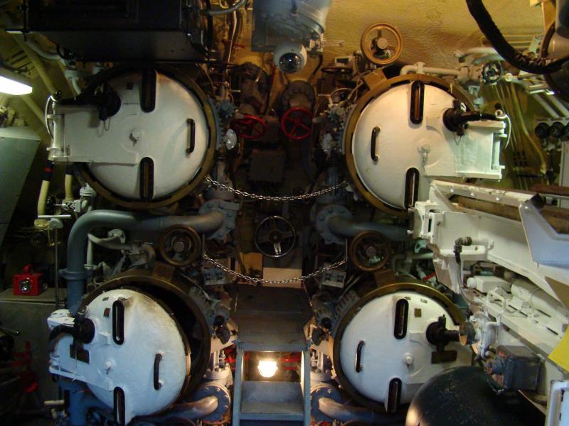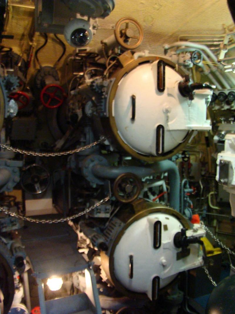Nelle prime 2 foto siamo sempre nella sala comandi e nella foto 2 si riconosce il periscopio. Quella nella foto 3 è la sala da pranzo degli ufficiali mentre nelle foto 4 e 5 si vedono gli alloggi sempre degli ufficiali. La foto 6 ritrae l'alloggio del comandante. Nelle ultime 2 foto si vedono le aperture delle camere lancia siluri. Oltre a questo piano c'era anche un piano di sotto nel sommergibile ma non era visitabile. Quando sono uscito mi sono chiesto in quante persone dovevano abitare e lavorare lì dentro e così a occhio avrei detto non più di 15, poi quando sono arrivato a casa sono andato su internet a cercare e ho visto che ci stavano in 49! Cavoli! In quello spazio risicato non deve essere stato facile viverci in così tanti. Poi le brande non erano abbastanza per tutti e quindi adottavano il metodo della branda calda e cioè c'era sempre qualcuno che dormiva in branda mentre gli altri lavoravano.