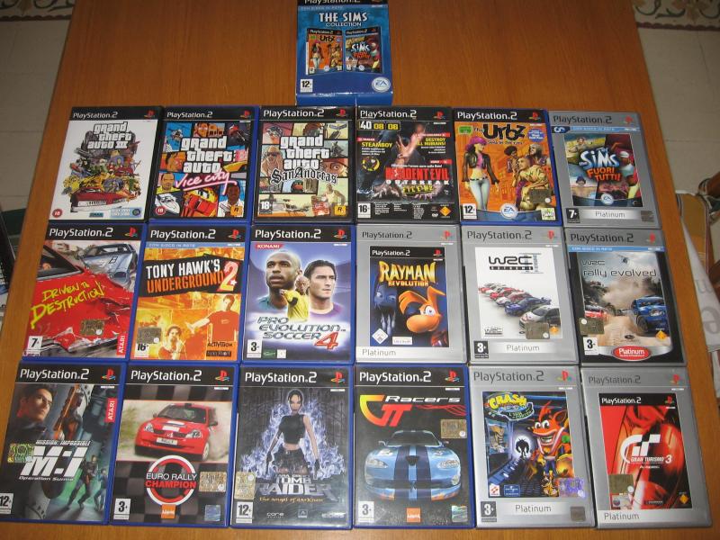 perazione surma,wrcII,wrc rally evolved,gran turismo3,euro rally champions,pro evolution soccer 4,tony hawk's 2,driven to destruction,the sims fuori tutti e the urbz sims in the city...più circa 80 giochi masterizzati anche titoli nuovi come per esempio pro evolution 2008 e 2009...fifa 08 ed altri...250 trattabili...ciao a tutti